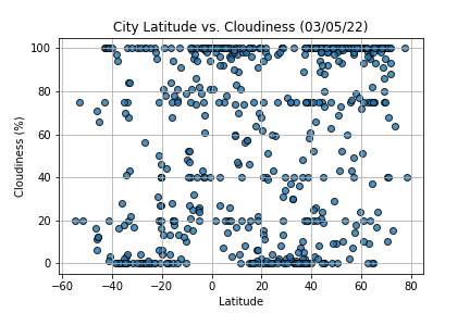 This study used the OpenWeatherMap API and Python/Pandas data tools to identify weather data from a range of random cities. These weather data points were plotted against the latitude of the city and are represented using MatPlotLib graphical library function. The date for analyses was 03/05/2022, but alternative dates are possible for further analyses using the OpenWeather API and Python/Pandas scripts stored in my GitHub Repo linked below.